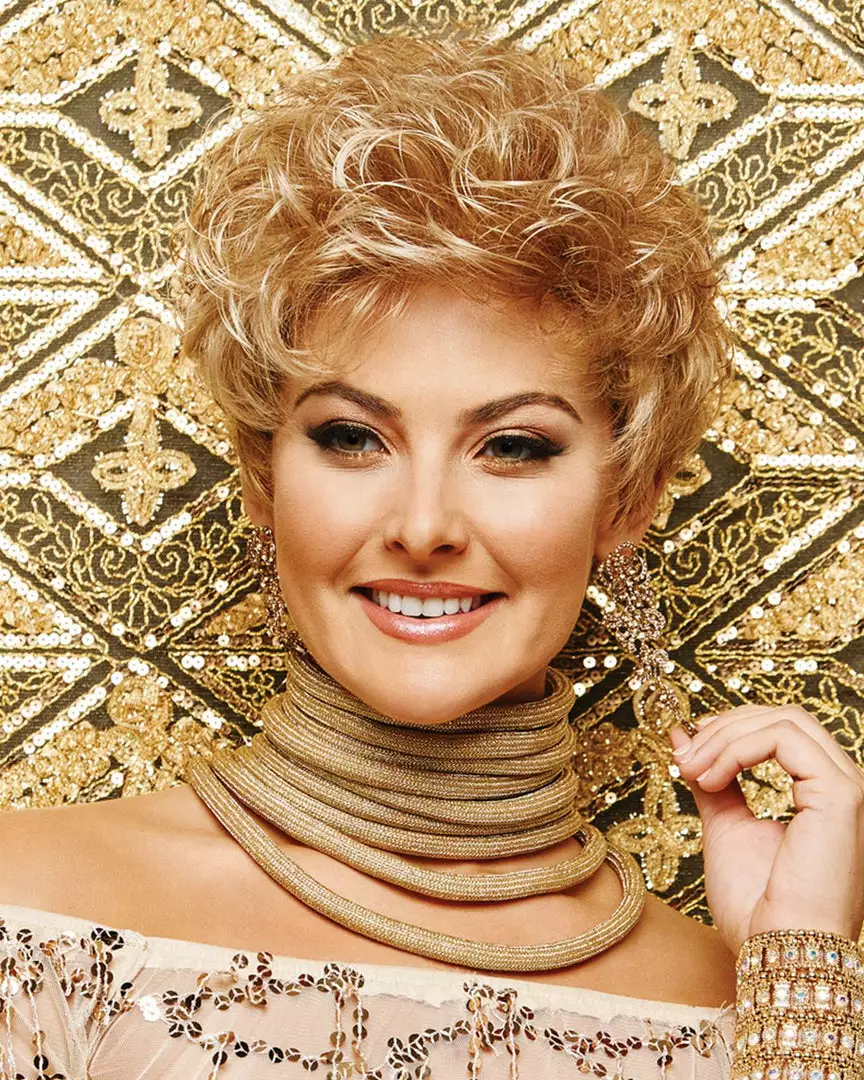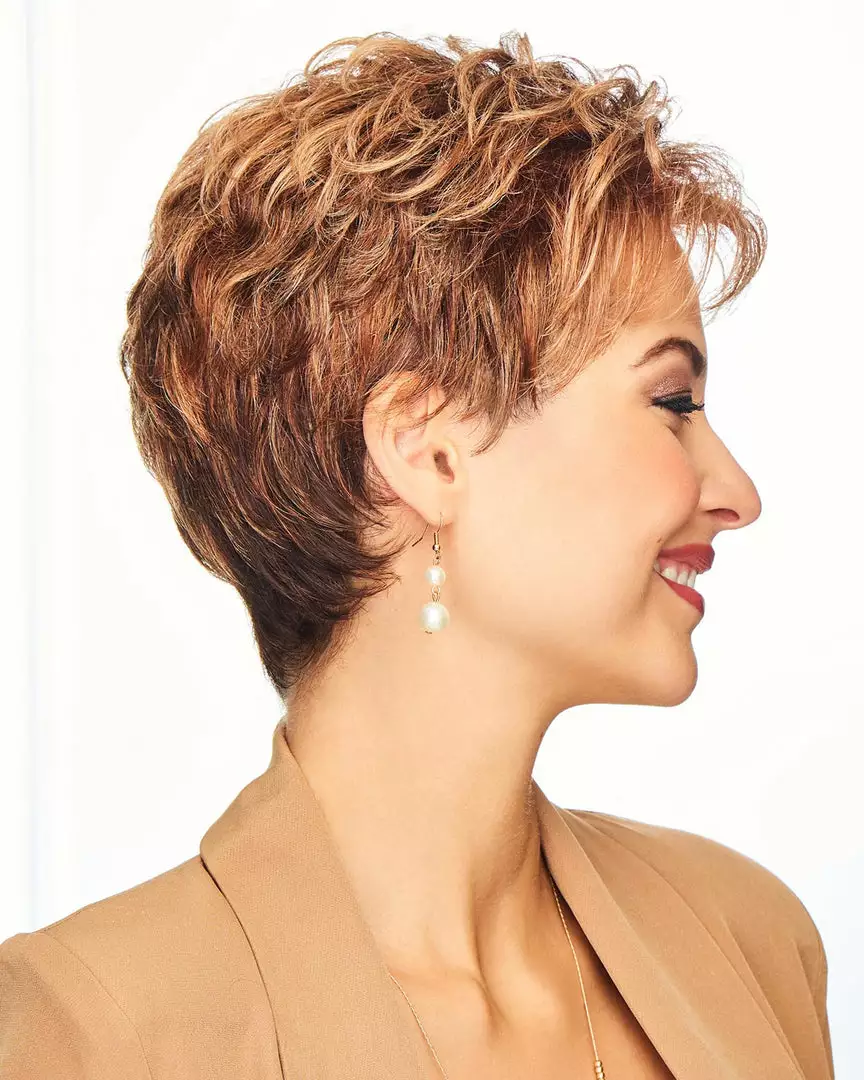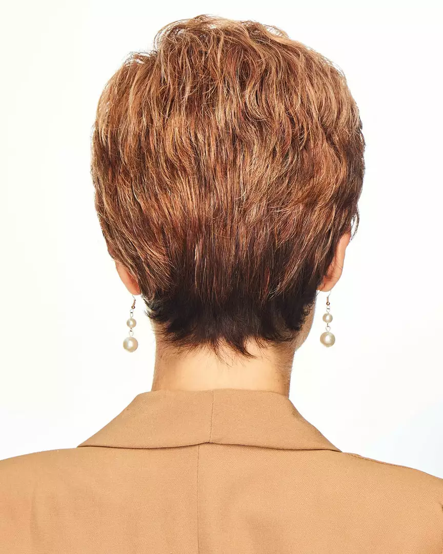 Short, waved layers beautifully blend to a neck-hugging, tapered nape.