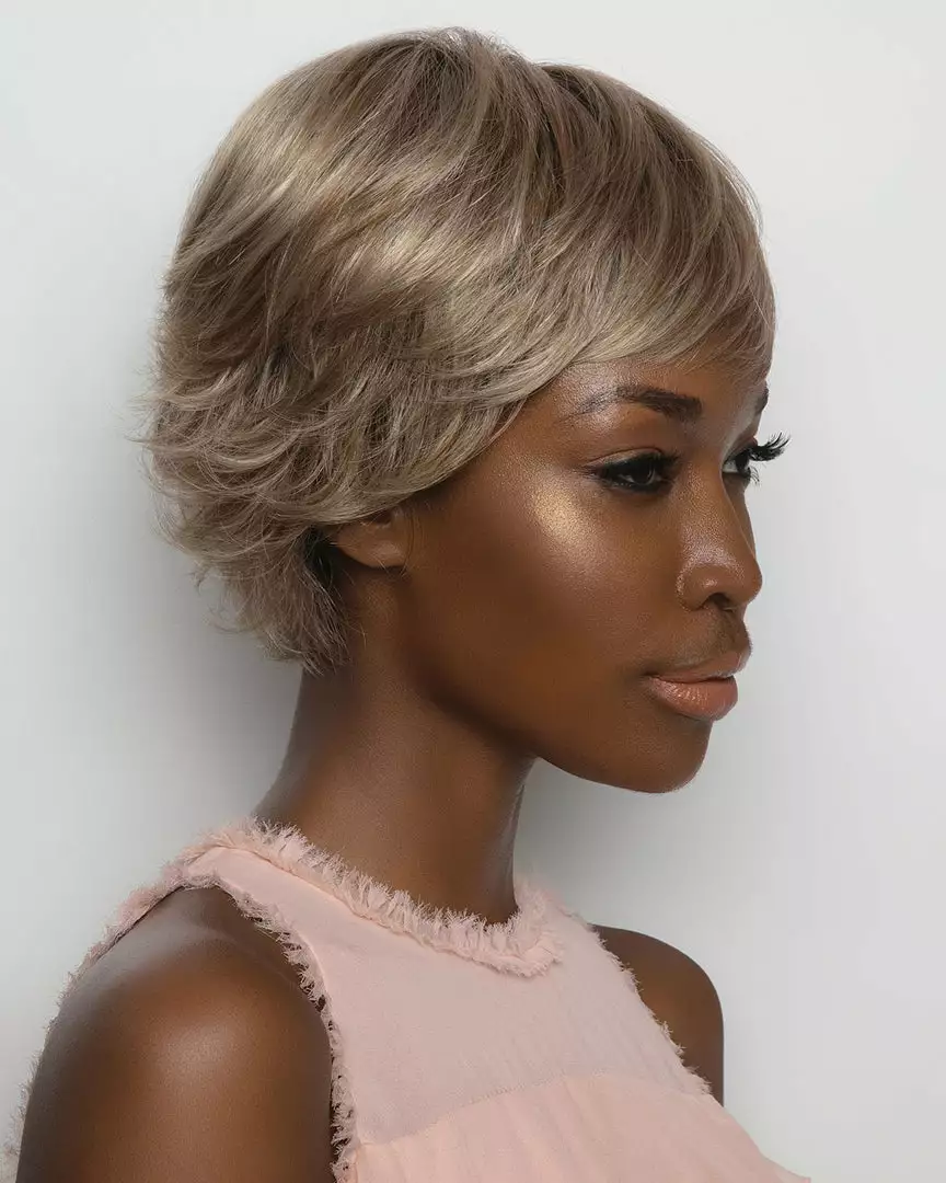 Albee is a short light pixie with soft waves and a monofilament top, ready for any kind of styling!