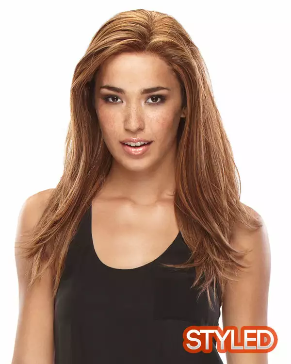 Sweeping below the shoulders, this long layered style provides the gorgeous flexibility of pre-permed Remy human hair with the natural comfort of a lace front.