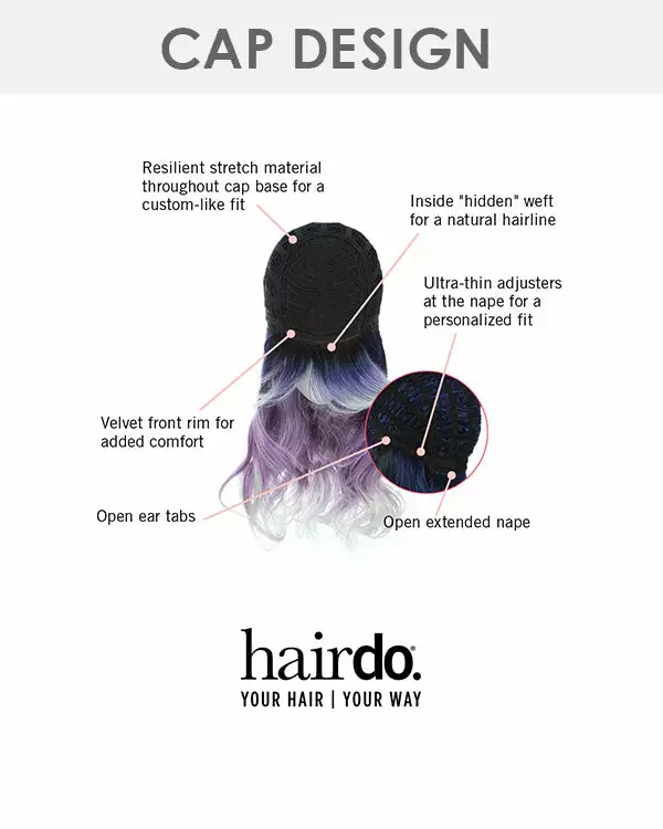 Melt hearts in this cool toned color combo. Long rooted waves boldly go from midnight blue to purple that fades into white lilac. The Tru2Life Heat-friendly synthetic fiber can be styled into a different curl pattern or completely straight. With a comfortable cap design you can wear it for a night out or even all day. Arctic Melt gives you #hairgoals…….no celebrity colorist or harsh chemicals required.