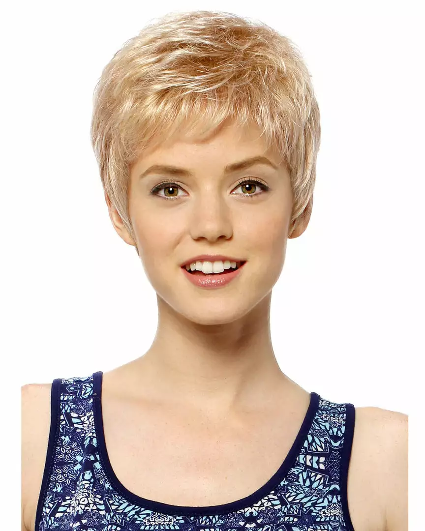 Look no further for the perfect pixie! Charlee is a modern, full-bodied pixie with lots of beautiful curls and just the right amount of wispy bangs.