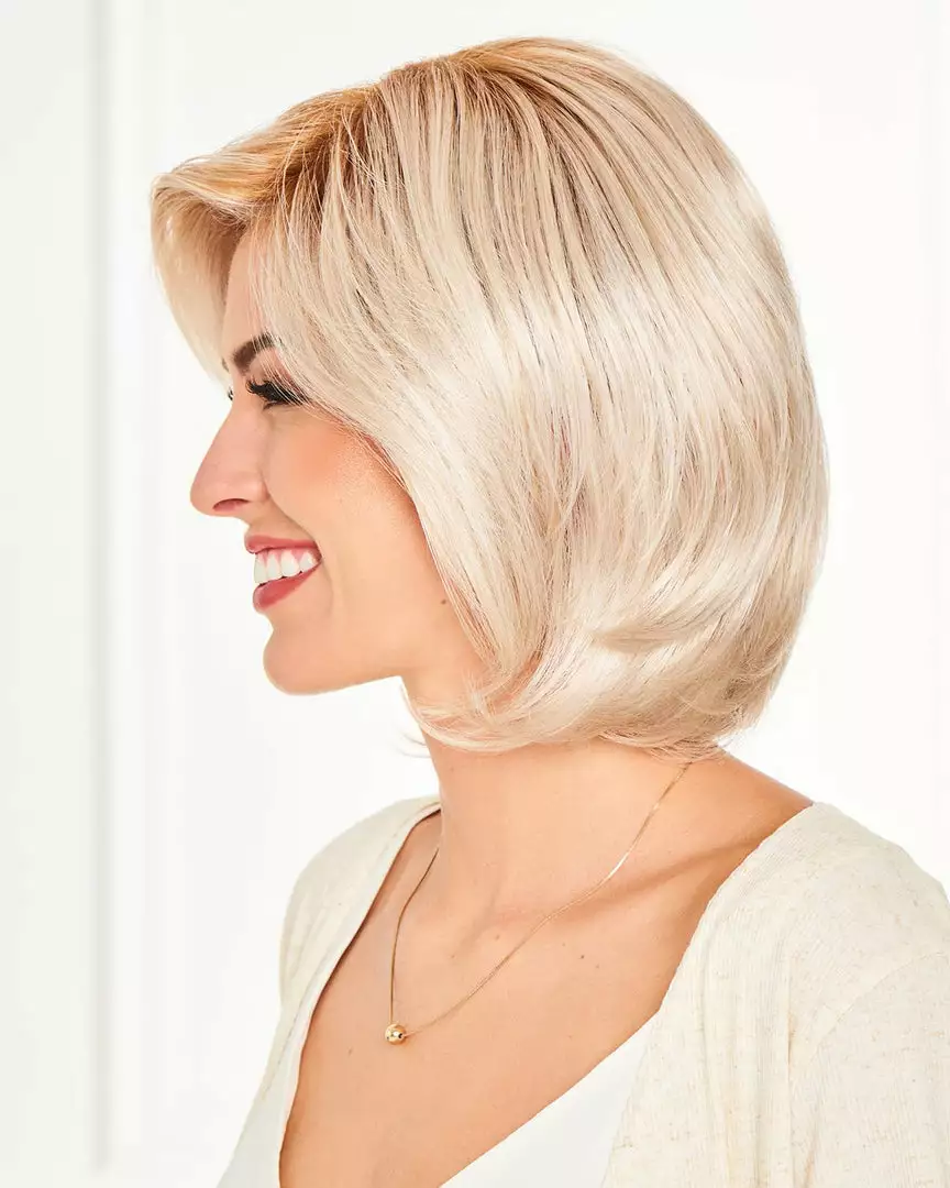 Temple-to-temple sheer lace along the front hairline allows the subtle bang to be worn forward or off the face.