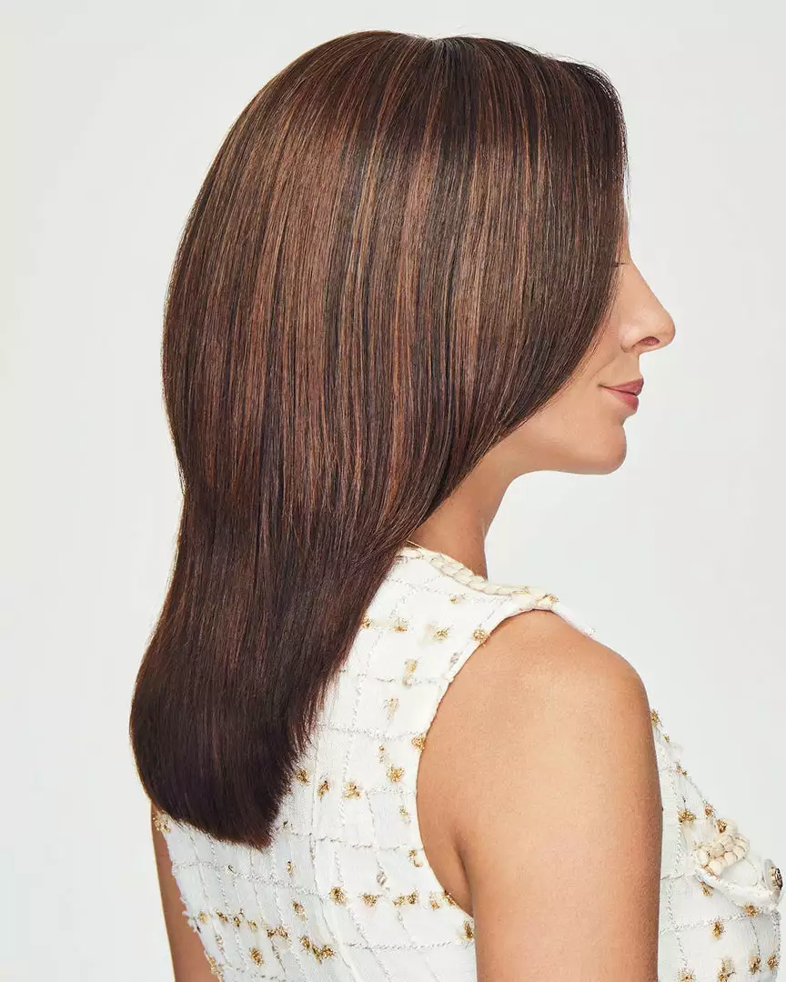The pear-shaped base of this elegant topper lets you position the smaller or wider end as needed to appropriately conceal the area of hair loss. An extended monofilament border lies flush to the head with no telltale edge. Our favorite feature? The soft, silky smooth extra layer protects and comforts a sensitive scalp. Choose the 10″ option to blend with chin to shoulder-length hair.