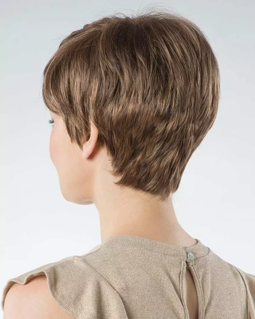 A textured pixie with an elongated fringe and wispy bangs. Sleek and ready for everyday wear.