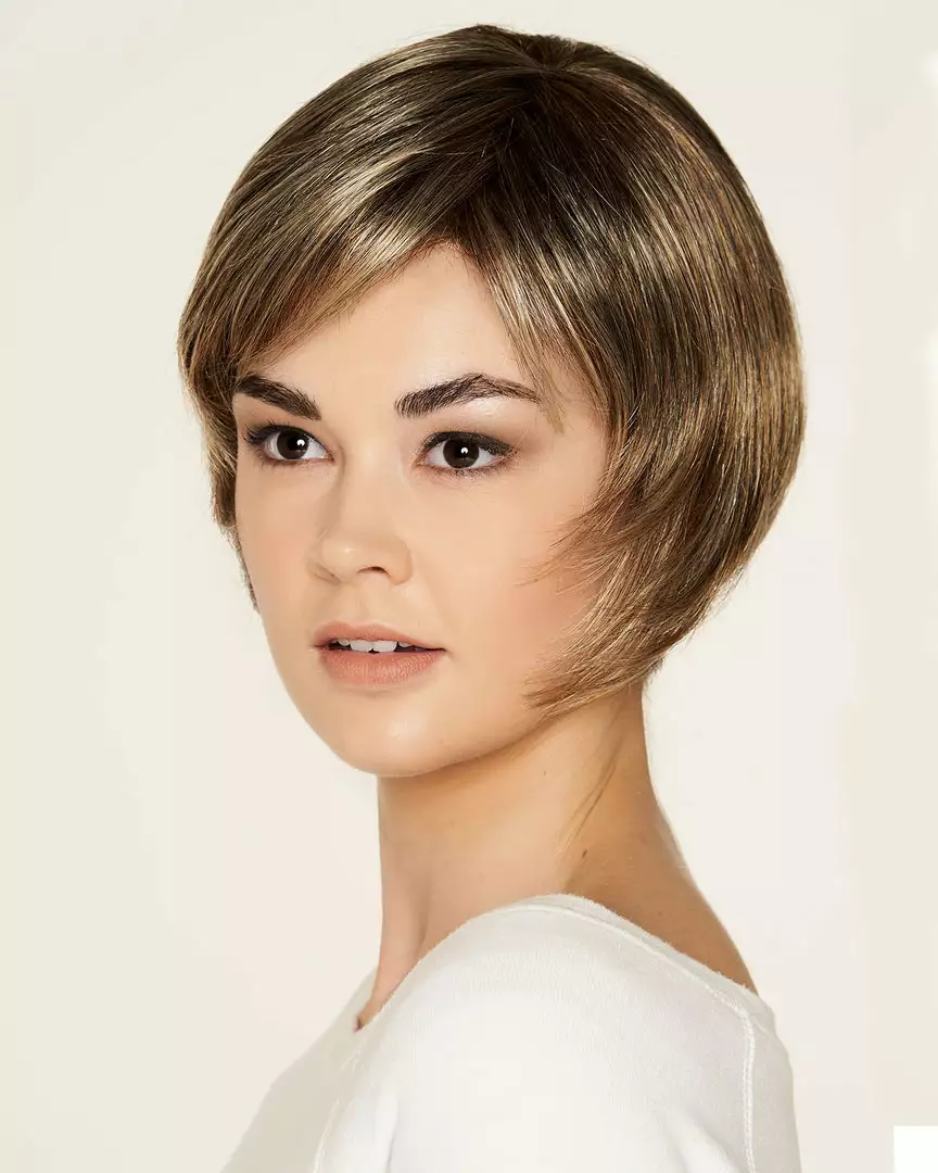 Naples is a short smooth hand-tied shag with a lace front construction for versatility and realism. The look of hair growth at the scalp with off the face styling provide confidence. Easy wear, lightweight with open wefts along the inside sides and back of wig cap allow breath-ability. A flattering style for most any face shape, and perfect choice as a medical wig for women with sensitive scalps and hair loss.