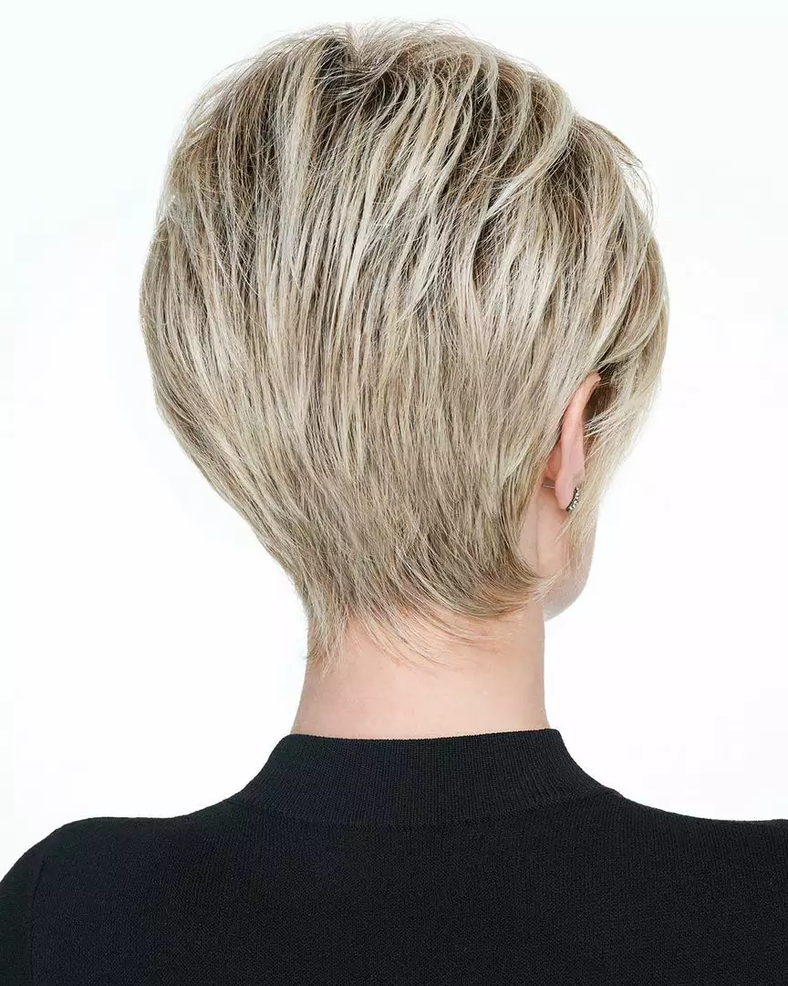 Whether brushed smooth and sleek or finger styled for a piecey look, this contemporary short style, includes a sculpted back for a stunning profile and shorter waved layers in the crown for fullness and texture. The slightly asymmetrical razor cut fringe adds an air of sophistication while the Sheer Indulgence lace front monofilament part affords added styling options.