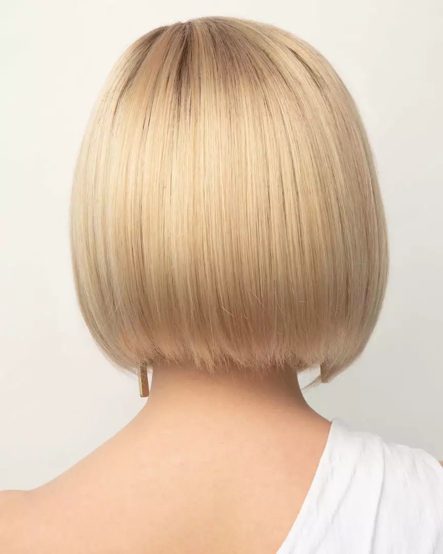 Chin length bob with wispy bangs. One of our most popular styles. Featuring a new lace front with monofilament part.