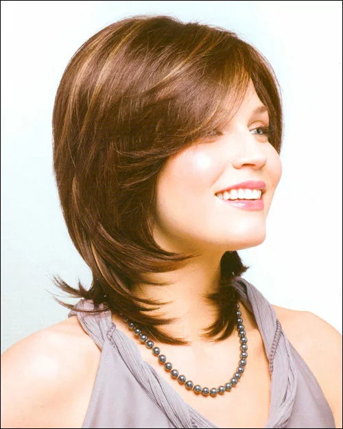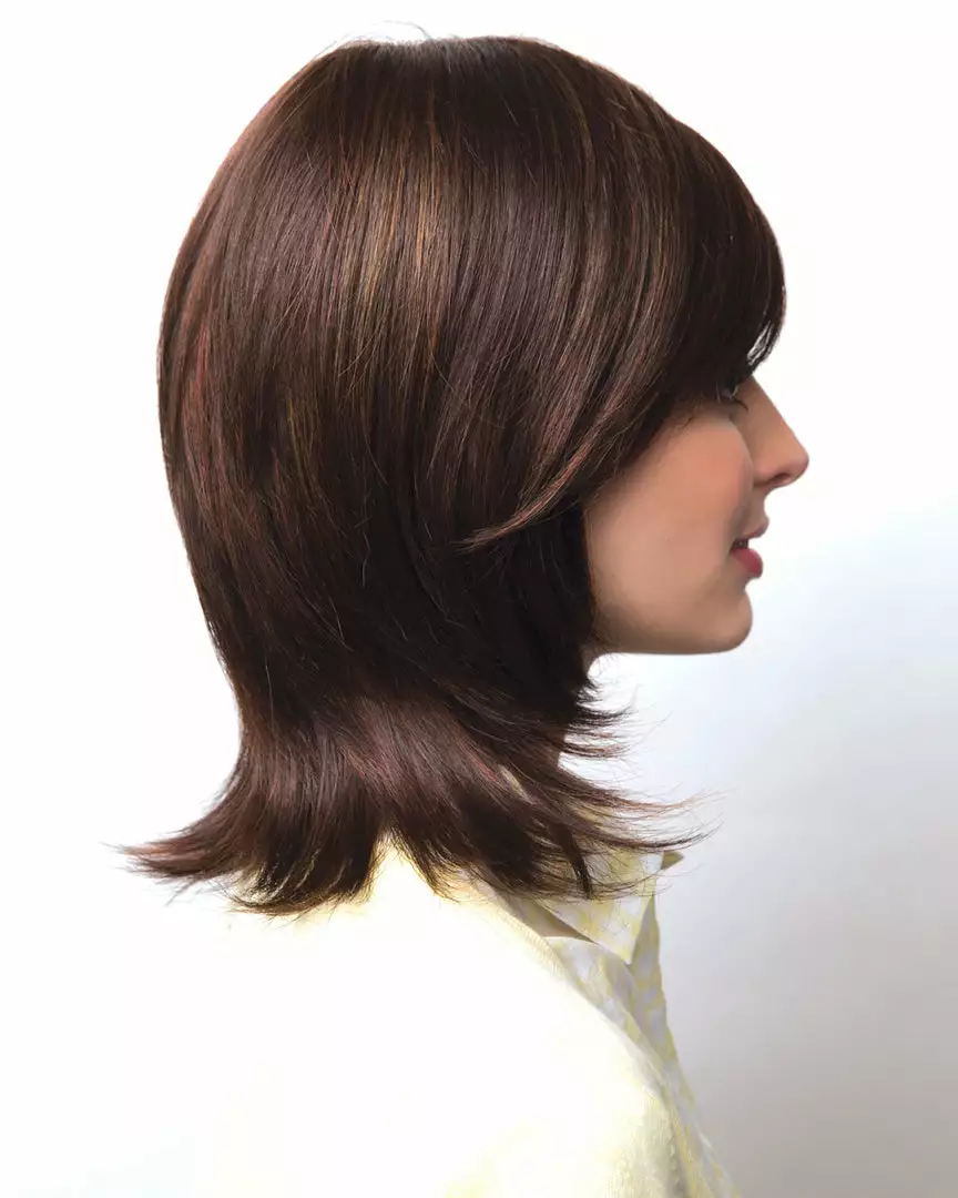 Swooped fringe and round layers complement this modern, yet easy going style.