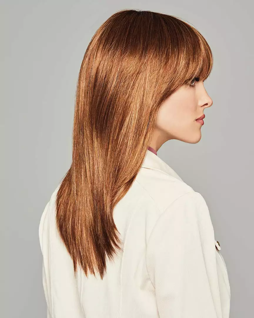 Sleek and straight with a trending full fringe that can be worn down or swept to one side. Razor cut ends add interest and movement. A monofilament center part brings this timeless look right up to date.