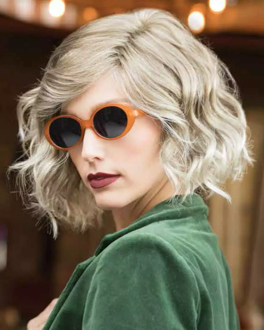 Short, flirty bob with side swept fringe and tousled waves. Featuring a lace front with lace part cap.