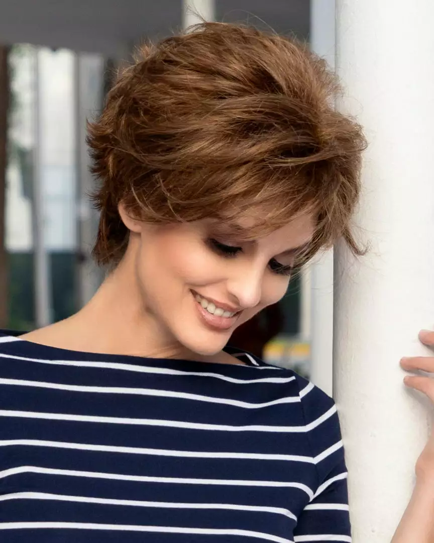 Micki by Envy offers lace front technology and mono top construction for this lightweight fashion statement. Soft layering with razor soft edges flip out to give a spunky textured appearance. Style this back or off to the side to create your own unique style with a natural hairline that is unsurpassed in lace front workmanship.