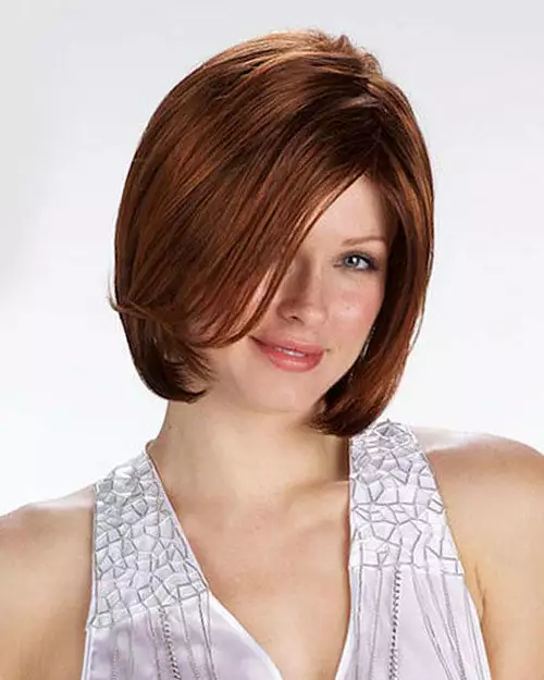 Chin length bob with elongated bangs, angled sides and a beveled nape.